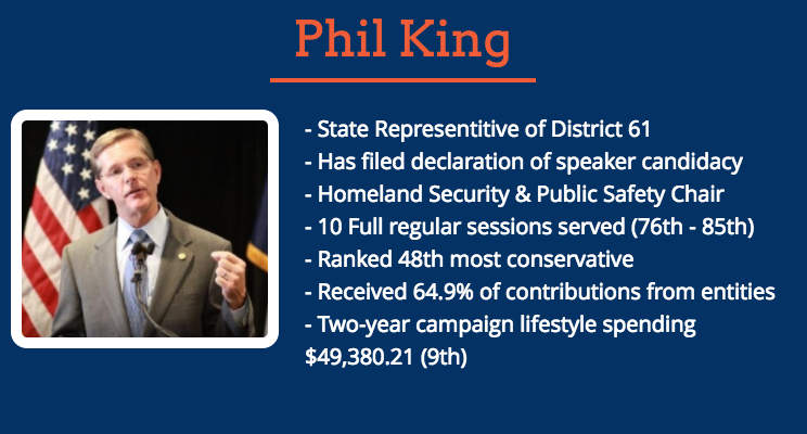 King was the first to announce and the only candidate who did it knowing he would be challenging five-term House Speaker Joe Straus. In October, a month after King’s announcement, Straus said he would not run again for the House.