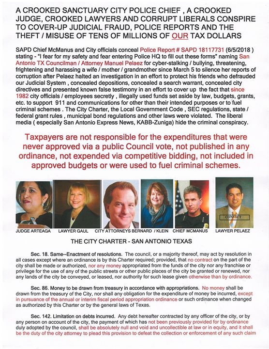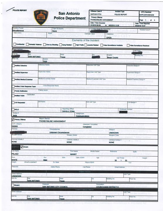 SAPD Chief McManus and the City cover up threats by City Councilman Manny Pelaez…..…A Police Report was filed 2 months ago on June 5 stating – “I fear for my safety and fear entering Police Headquarters to fill out these forms”……Police report # SAPD 18117731 is on file naming San Antonio TX Democrat Councilman Manuel Pelaez for cyber-stalking, cyber-bullying, threatening, frightening defaming ( insinuating that she has mental health issues for reporting corruption) and harassing a wife/mother/grandmother since March 5 to silence her reports of corruption …..Read Councilman Pelaez’s vile attacks here: ……https://texasmonitor.org/san-antonio-councilman-uses-facebook-mock-activist-couple/ …….