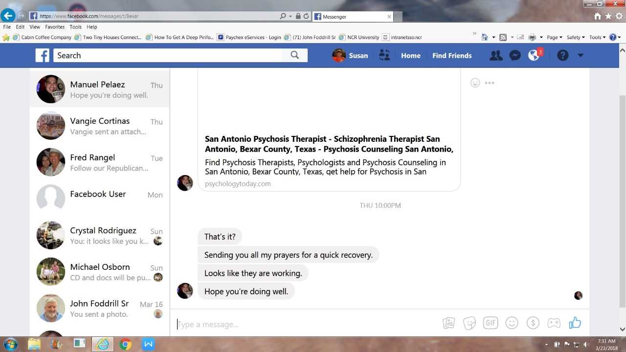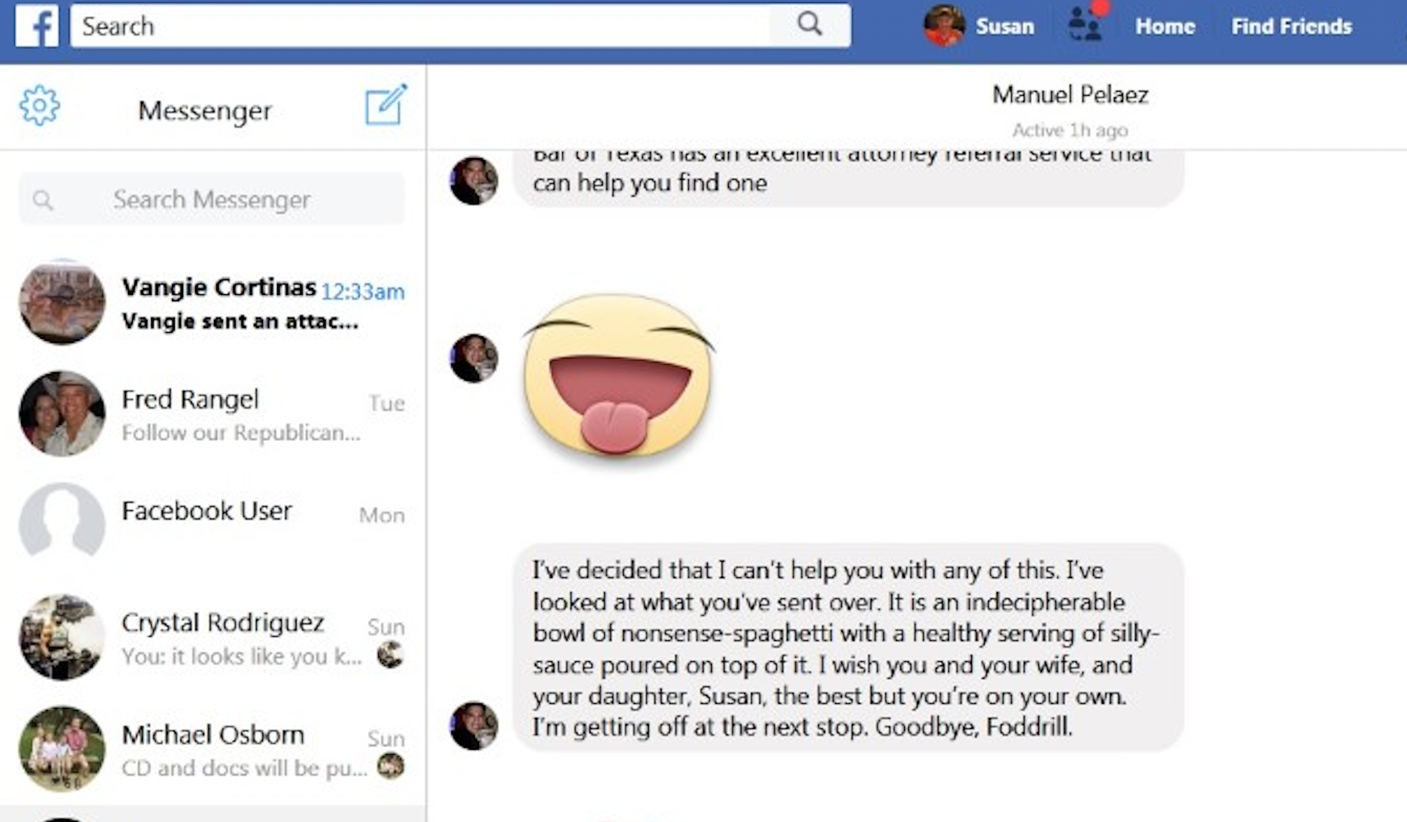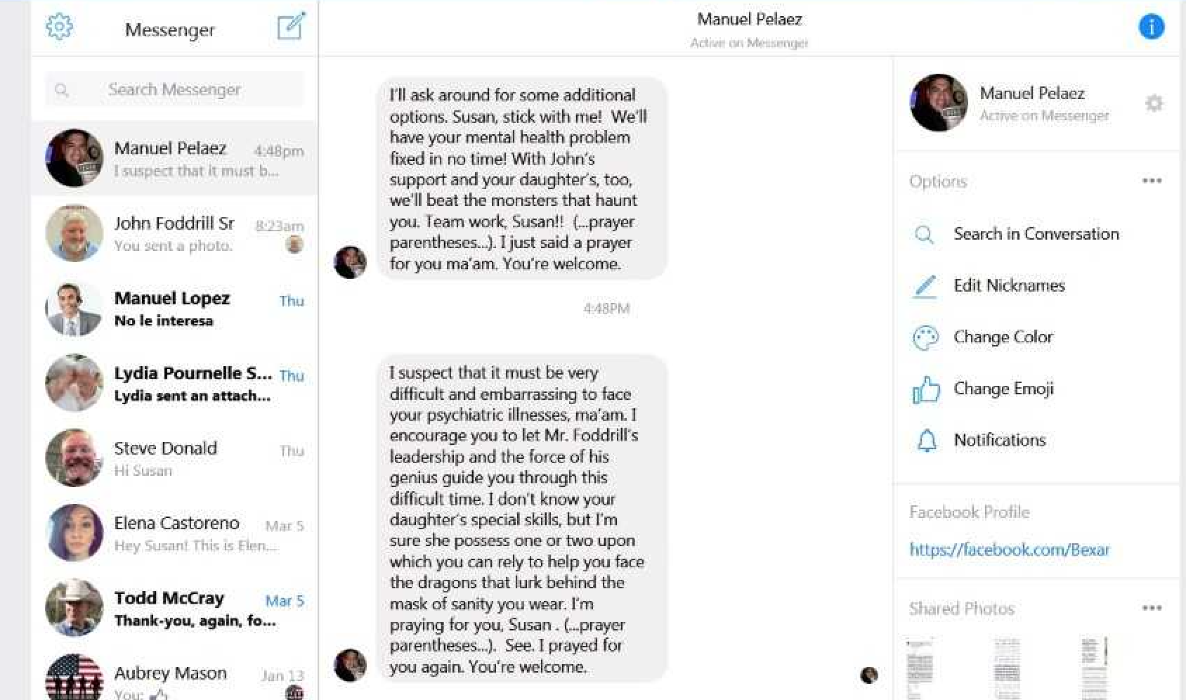 In a Facebook message dated March 16, Pelaez addressed Susan Foddrill directly, the Facebook message shows.